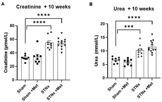 Subtotal nephrectomy increases serum creatinine and urea levels. Serum creatinine (µmol/L) (A) and urea (mmol/L) (B) at 10 weeks post-sham or -STNx ± metoprolol. (*** p < 0.001, **** p < 0.0001) (n = 7–12).