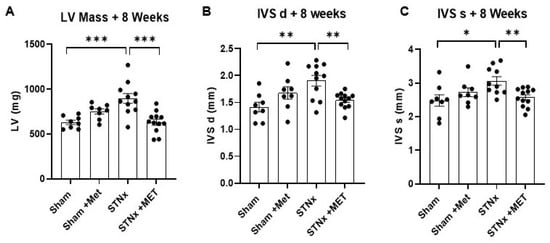 Metoprolol attenuates subtotal nephrectomy induced indices of cardiac mass. Echocardiographic assessment of left ventricular mass (A) and interventricular septal thickness in diastole (B) and systole (C), 8 weeks post-sham or -STNx ± metoprolol. (* p < 0.05, ** p < 0.01, *** p < 0.001) (n = 8–12).