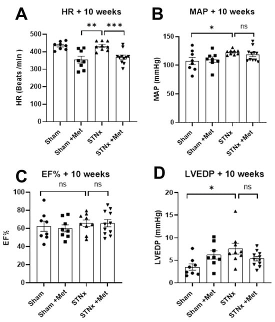 Effect of metoprolol on cardiac hemodynamics. Cardiac parameters as assessed by Millar pressure-volume conductance catheters. Heart rate (A), blood pressure (B), left ventricular ejection fraction (C) and end diastolic pressure (D) measured 10 weeks post-sham or -STNx ± metoprolol. (* p < 0.05, ** p < 0.01, *** p < 0.001) (n = 8–11).