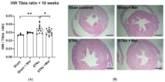 Metoprolol attenuates subtotal nephrectomy-induced left ventricular hypertrophy. Ventricular weight/tibia length ratio (cardiac weight index) from animals 10 weeks post-sham or -STNx ± metoprolol (A). Histological assessment of left ventricular mass 10 weeks post-sham or -STNx ± metoprolol (B). Hearts stained with H&E. (* p < 0.05, ** p < 0.01) (n = 4–12). Scale bars 200 µm.