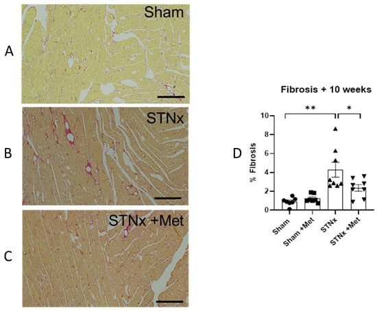 Metoprolol attenuates subtotal nephrectomy-induced cardiac fibrosis. Fibrosis is increased in ventricles of the heart 10 weeks post-nephrectomy, an effect attenuated with metoprolol. Representative histological images of 5µm sections of ventricle stained for collagen with picrosirius red in sham hearts (A) following STNx alone (B) and co-treatment with metoprolol (C). Summary of quantification of collagen staining in ventricles of rats 10 weeks post-sham or -STNx ± metoprolol (D). (* p < 0.05, ** p < 0.01) (n = 7–8). Scale bar 200 µm.