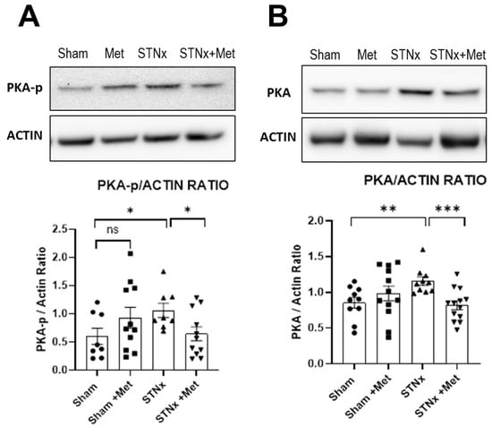 Metoprolol attenuates subtotal nephrectomy-induced PKA activation. Representative western blots of phosphorylated phosphorylate PKA (PKA-p) and beta-actin along with summary of PKA-p quantification (A) and representative western blot of total PKA and the corresponding summary of total PKA quantification (B) in ventricles of rats 10 weeks post-sham or -STNx ± metoprolol. (* p < 0.05, ** p < 0.01,*** p < 0.001) (n = 8–13).