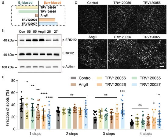 Reagents. Angiotensin II, TRV120056, TRV120055, TRV120026, and TRV120027 were purchased from Sigma-Aldrich (Saint Louis, MI, USA) and GenScript (Piscataway, NJ, USA). YM-254890 was purchased from Macklin (Shanghai, China). Lipofectamine 3000 was purchased from Thermo Fisher, Waltham, MA, USA. Antibodies were listed as follows: anti-phospho-ERK antibody (4370, Cell Signaling Technology, Boston, MA, USA), anti-ERK antibody (4695, Cell Signaling Technology), anti-β-arrestin 1 antibody (30036, Cell Signaling Technology), anti-β-arrestin 2 antibody (3857, Cell Signaling Technology), and anti-α-actinin antibody (69758, Cell Signaling Technology).