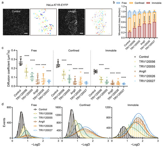 Considering that the diffusive behaviors of membrane-bound proteins are influenced by the size of their membrane-bound regions [45], the observed slower diffusion coefficient of AT1R implies that they underwent higher-order oligomerization induced by β-arrestin-biased ligands. These tracking results were in accordance with our findings from photobleaching analyses. Consequently, our data indicated that both G-protein-biased and βarr-biased ligand actions are closely linked to ligand-induced AT1R aggregation. Moreover, a higher degree of AT1R aggregation appears to be particularly associated with βarr-dependent signaling, suggesting that the particular aggregation and dynamic of AT1R molecules reflect their biased functional activation states.