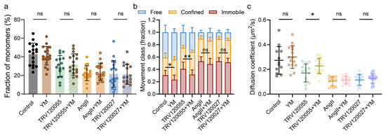 Next, we aimed to confirm the relationship between different biased pathways with AT1R molecular behavior, focusing on the downstream effector proteins. First, we investigated the effect of the G protein-biased signaling for the receptor dimers/oligomers observed above. Since AT1R exerts G protein signaling notably through Gq-mediated activation, the YM-254890 (YM) was introduced to inhibit Gq protein function (Figure S2). We found that YM had little effect on the assembly of AT1R into dimers or oligomers following stimulations with the balanced ligand AngII, the G protein-biased ligand TRV120055, and the βarr-biased ligand TRV120027 (Figure 4a).