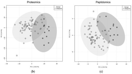 Workflow and principal component analysis (PCA) of benign and malignant samples in both the proteomics screening from the pellet fraction and the peptidomics screening of the supernatant: (a) schematic of sample preparation and analysis of the protein and peptide fractions; PCA scores plot computed using multivariate analysis of (b) proteomics data and (c) peptidomics data for benign (grey) and malignant (black) thyroid lesions.