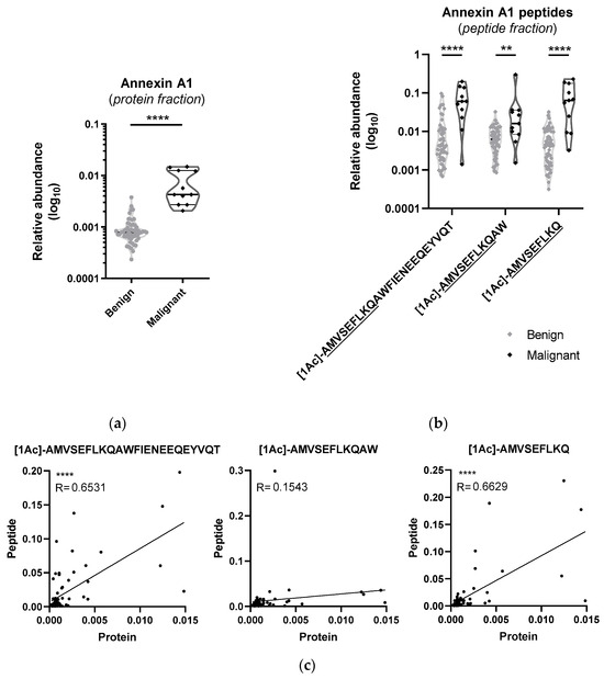 Annexin A1 peptides found in the supernatant were increased, similarly to the protein quantification obtained in the proteomics screening: violin plots with individual sample representation of (a) annexin A1 protein from the proteomics analysis and (b) peptides of annexin A1 from the peptidomics analysis of the peptide fraction of the same tissue samples. Peptide sequences are represented by amino acid one letter code and acetylation at the N-termini is represented by [1Ac]. Benign samples are represented in grey and malignant ones in black. ** p ≤ 0.01, **** p ≤ 0.0001 (Mann–Whitney test). (c) Correlations between annexin A1 protein from the proteomics analysis and each peptide from the peptidomics analysis. **** p ≤ 0.0001 (Pearson correlation).