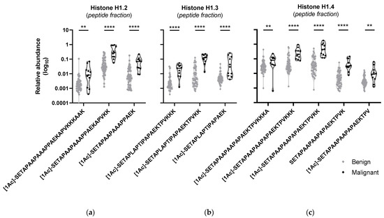 Peptides and acetylated peptides from histones were found increased in malignant samples: violin plots with individual sample representation of peptides of histones (a) H1.2, (b) H1.3 and (c) H1.4 from the peptidomics analysis of the peptide fraction of tissue samples of benign versus malignant groups. Peptide sequences are represented by amino acid one letter code and acetylation at the N-termini is represented by [1Ac]. Benign samples are represented in grey and malignant ones in black. ** p ≤ 0.01, **** p ≤ 0.0001 (Mann–Whitney test).