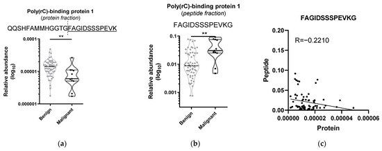 Differential abundance in the same amino acid sequence of Poly(rC)-binding protein 1 suggests differences in enzymatic activity: violin plots with individual sample representations of (a) Poly(rC)-binding protein 1 peptide from the proteomics analysis and (b) part of that same peptide from the peptidomics analysis of the peptide fraction of the same tissue samples, of benign versus malignant groups. Peptide sequences are represented by amino acid one letter code. Benign samples are represented in grey and malignant ones in black. The dashed vertical line in the peptide sequence represents a possible cleavage site. ** p ≤ 0.01 (Mann–Whitney test). (c) Correlation between poly(rC)-binding protein 1 from the proteomics analysis and peptide FAGIDSSSPEVKG from the peptidomics analysis. Non-significant (Pearson correlation).