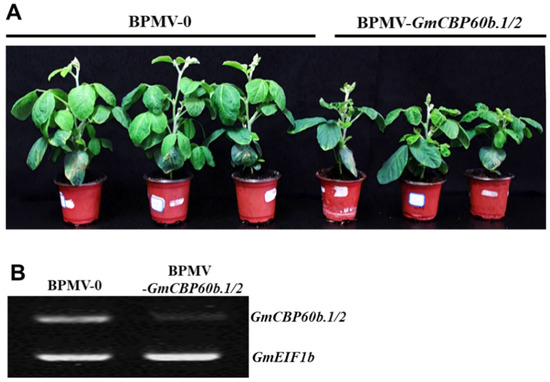 It has been reported that CBP601b plays a critical role in immunity in the model plant Arabidopsis [11,12]. However, the function of CBP601b homologues in soybean immunity has not been previously investigated. To this end, the BPMV-VIGS system was used to investigate the functions of GmCBP60bs. Soybeans are a paleopolyploid, in which 75% of the genes in their genome have two copies [14]. Consistent with this, two homologous GmCBP60bs sharing 97% identity at the nucleotide level were identified in the soybean genome, and they were referred to as GmCBP60b.1 and GmCBP60b.2. GmCBP60b.1 and GmCBP60b.2 share 67% and 66% similarity with Arabidopsis CBP60b, respectively. To overcome the functional redundancy of these two genes, a 303 bp fragment amplified from GmCBP60b.1 sharing 98% identity at the nucleotide level with the corresponding region of CBP60b.2 was cloned into the BPMV-2 vector [15,16]. To infect the soybean plants, the plasmid DNA of the BPMV1 vector was co-bombarded with plasmid DNA of either the BPMV2 empty vector (referred to as BPMV-0) or BPMV-GmCBP60b.1/2 (referred to as BPMV-GmCBP60b.1/2) into the first two true leaves of 7-day-old soybean seedlings. The viral symptoms were visible on the upper systemic leaves of the bombarded plants at 15 to 20 days post-bombardment (dpb). The systemic leaves with viral symptoms were ground in a phosphate buffer (pH 7.0). The liquid phase (sap), containing numerous viral particles, was collected and stored at −80 °C for subsequent batch inoculations.
