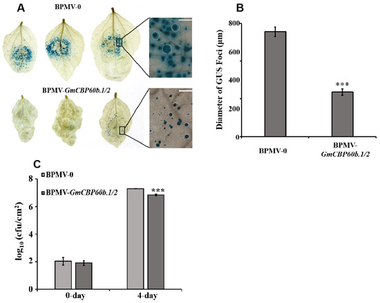 To test whether the stunted phenotype is associated with activated defense responses, we firstly inoculated BPMV-0 and BPMV-GmCBP60b1/2 plants with the SMV N strain fused with the GUS reporter gene (SMV-N-GUS) [17] via biolistic bombardment. The successful infection of SMV-N-GUS can be visualized by the presence of blue GUS foci. The intensities and diameters of the GUS foci reflect replication efficiency and cell-to-cell movement, respectively. As shown in Figure 2A, much fewer blue GUS foci were observed on the infected leaves of the GmCBP60b1/2-silenced plants than on the infected vector control leaves. In addition, the diameter of the GUS foci was significantly smaller on the infected leaves of the GmCBP60b.1/2-silenced plants than on the infected vector control leaves (Figure 2B), indicating that silencing GmCBP60b.1/2 enhances resistance to SMV-N-GUS.