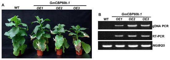 To further understand the function of GmCBP60b in immunity and overcome the difficulty of soybean transformation, we generated transgenic tobacco lines that overexpress GmCBP60b.1. The tobacco GmCBP60b.1-overexpressing lines displayed a stunted stature compared to the wide-type (WT) plants (Figure 3A). To our surprise, spontaneous cell death was observed on the leaves of the GmCBP60b.1-overexpressing tobacco lines (Figure 3A, see arrows), suggesting that the immune responses might be activated. The authenticity of the transgenic plants was verified by both genomic PCR and an RT-PCR analysis (Figure 3B).