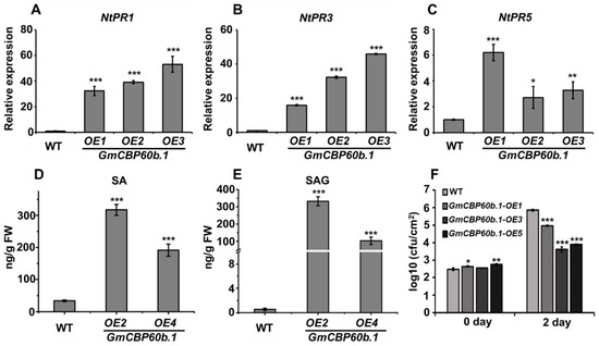 Overexpression of GmCBP60b.1 leads to elevated SA accumulation levels, induced PR gene expression, and enhance resistance against Pst DC3000 in tobacco. (A–C) The expression of PR1, PR3, and PR5 was significantly induced in the GmCBP60b.1-overexpressing plants, determined using RT-qPCR analysis. Student’s t-test (*, p < 0.05; **, p < 0.05; ***, p < 0.001). Comparison of free SA content (D) and SAG content (E) in leaves of wild-type tobacco plants and the GmCBP60b.1-overexpressing plants. (F) Comparison of colony-forming units between WT plants and the GmCBP60b.1-overexppressing plants at 0 dpi and 2 dpi of Pst DC3000 infection. Student’s t-test (***, p < 0.001).