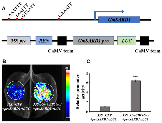 In Arabidopsis, CBP60b binds to the core cis-element G(A/T)AATT(T/G) in the promoter regions of defense-related genes, such as SARD1 and ICS1, and it activates their expression [11,12]. We found that there were four core cis-element-like motifs, (G/A/T)AATT, within a 1240 bp promoter region of GmSARD1 (Figure 5A, upper panel). We reasoned that GmCBP60b might be able to bind these motifs and thus activate the expression of GmSARD1. To test this possibility, we first cloned a 1240 bp fragment of the GmSARD1promoter into a pGreenII0800-LUC vector to generate a proGmSARD1::LUC construct (Figure 5A, lower panel). Next, we transiently coexpressed 35S::GmCBP60b.1 with proGmSARD1::LUC in the leaves of N. benthamiana plants via agro-infiltration. If our postulation is correct, the expression of the luciferase gene will be activated in the presence of GmCBP60b in the infiltrated region. As expected, the expression of the luciferase gene was highly activated in the co-infiltrated area (Figure 5B, right), indicating that GmCBP60b could bind to the (G/A/T)AATT motifs and activate the expression of the LUC reporter gene. Because the pGreenII0800-LUC vector also carries a 35S::Rluc cassette, the relative promoter activity of the proGmSARD1 could be normalized by Renilla luciferase, which serves as a control. As shown in Figure 5C, the relative promoter activity of proGmSARD1 was significantly higher in the presence of GmCBP60b.1 than in the presence of GFP, further confirming that GmCBP60b.1 can activate the expression of the LUC reporter gene driven by the GmSARD1 promoter. We found that the LUC reporter gene was also induced to a certain level in the area co-infiltrated with proGmSARD1::LUC and 35S::GFP (Figure 5B, left), which could be activated by one or more endogenous CBP60b-like protein(s).