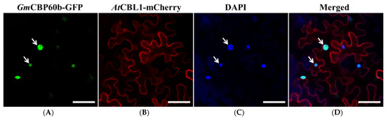 CBP60b is a transcription factor that is supposed to be localized in the nucleus. To experimentally prove this, GmCBP60b.1 was N-terminally fused with GFP, and the resulting 35S::GmCBP60b.1-GFP fusion construct was transiently coexpressed with AtCBL1-mCherry in the leaves of N. benthamiana plants via agro-infiltration, followed by observation under a confocal microscope. Consistent with its role as a transcription factor, GmCBP60b.1-GFP signals were exclusively localized in the nuclei, which were colocalized with the blue signals specifically stained by DAPI (Figure 6, see arrows). As a control, AtCBL1-mCherry was exclusively localized on the plasma membrane (PM).