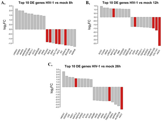 Top 10 up- and downregulated DEGs at the 8 (A), 12 (B) and 26 (C) hour time-points following transduction with HIV-1. log2FC of the up- and downregulated transcripts coding for proteins in HIV-1 transduced HEK-293T cells compared to mock transduction. Red bars show genes that are regulated similarly in all observed time-points compared with mock-transduced samples, while grey bars correspond to the significantly altered transcripts that were regulated only in the given time-point.