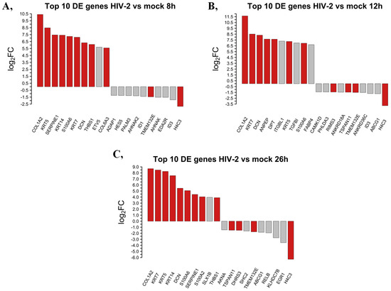 Top 10 up- and downregulated DEGs at the 8 (A), 12 (B) and 26 (C) hours time-points following transduction with HIV-2. log2FC of the up- and downregulated transcripts coding for proteins in HIV-2 transduced HEK-293T cells, compared to mock transduction. Red bars show genes that are regulated similarly in all observed time points, while grey bars correspond to the significantly altered transcripts that were regulated only in the given time-point.