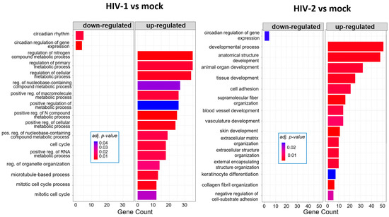 Gene ontology (GO) analysis of DEGs in HIV-1 (left) and HIV-2 (right) transduced cells at the 26 h time-point. Top genes classified according to significant enrichment terms. Color intensity corresponds to the significance of each term. Counts represent the number of differentially expressed genes associated with the listed gene ontology ID.