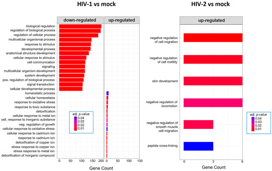 Twenty-six hours post-transduction, HIV-1 altered the regulation of genes involved in response to oxidative stress, response to toxic substances and homeostatic processes. Meanwhile, HIV-2 affected genes that are part of the negative regulation of cell motility, negative regulation of cell migration and peptide cross-linking (Figure 7). A full list of the detected GO terms can be found in Tables S5 and S6.