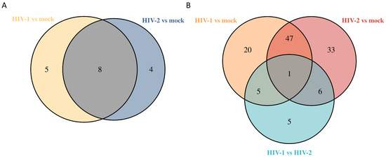 Venn diagram showing differential protein expression between HIV-1 vs. mock or HIV-2 vs. mock transduced samples at 12 (A) and additionally between HIV-1 vs. HIV-2 at 26 (B) hours post-transduction.