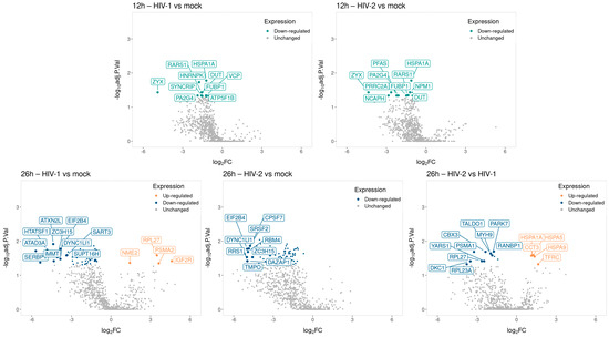 Volcano plot illustrating the changes in protein abundance in HIV-1 and HIV-2 transduced cells at 12 and 26 h post-transduction. The x-axis displays the log2 fold change (log2FC) of detected proteins, while the y-axis shows the log10 adjusted p-value for each protein. Each dot represents a detected protein, with color indicating significant upregulation (light orange) or downregulation (green, blue), and grey dots representing non-significantly regulated proteins. Note that only the top ten significantly regulated proteins, either up or downregulated, are labeled in the plot for each category.