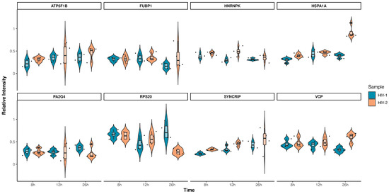 Violin plots depicting the intensity distribution of differentially regulated proteins across all observed time-points for HIV-1 (blue) and HIV-2 (light orange) transduced cells. The x-axis represents the distinct time-points, while the y-axis corresponds to the protein’s intensity.