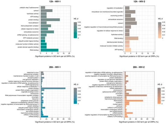 Classification of gene ontology (GO) terms of the enriched significant proteins from HIV-1 (left) and 2 (right) infected cells 12 (top) and 26 (bottom) hours post-transduction compared with the mock. Color intensity refers to the adjusted p-value of each term, while the x-axis is the percentages of significant proteins in GO term per all differentially expressed proteins (DEPs). The names of the enriched GO terms are on the y-axis.