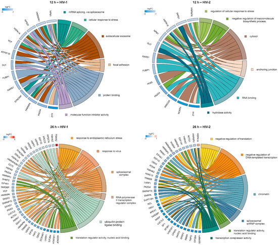 To further enrich the relations between the DEPs and the GO terms, we selected six GO terms from HIV-1 and HIV-2-transduced samples at 12 and 26 h. The relationship between the DEPs and selected GO terms, as well as the logFC of the DEPs, are shown in Figure 12.