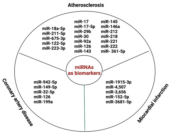 miRNA is a class of small regulatory RNAs that regulate protein expression in recipient cells in a paracrine fashion. A promising biomarker for AS diagnosis, related to the occurrence of adverse cardiovascular events, is miR-18a-5p [114]. Also, serum miR-211-5p and miR-675-3p are new diagnostic biomarkers that are associated with the poor prognosis of AS [115]. miR-637 showed important predictive value for the occurrence of future cardiovascular events [116]. Circulating miRNAs, such as miR-17, miR-17-5p, miR-29b, miR-30, miR-92a, miR-126, miR-143, miR-145, miR-146a, miR-212, miR-218, miR-221, miR-222, and miR- 361-5p, are promising biomarkers for the clinical diagnosis of atherosclerosis [117]. Furthermore, miR-122-5p and miR-223-3p might be markers of plaque instability [118].