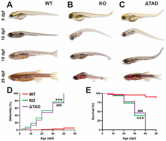 Deformity and mortality of Stat3 mutants. Representative images of Stat3 wildtype (WT: A), knockout (KO: B), and transactivation domain truncation (ΔTAD: C) mutants presenting with deformities at the indicated time points. The incidence of deformity (D) and relative survival (E) in these mutants compared to wildtype (WT) individuals are presented as Kaplan–Meier plots, with statistical significance indicated between WT and KO (*** p < 0.001) as well as WT and ΔTAD (### p < 0.001).