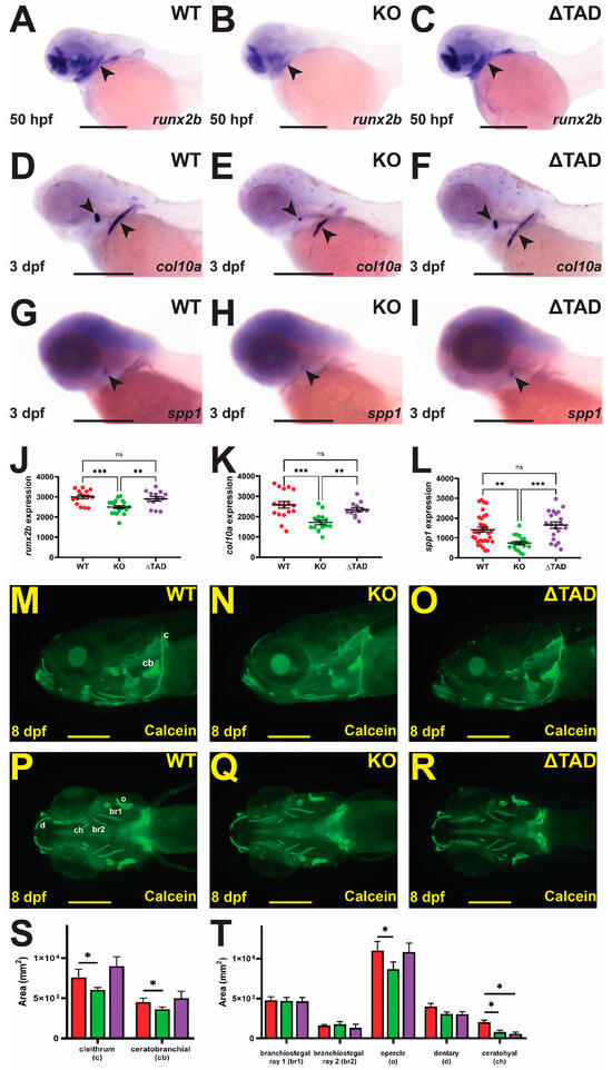 Effect of Stat3 mutations on bone formation. Representative images of Stat3 wildtype (WT: A,D,G,M,P), knockout (KO: B,E,H,N,Q), and transactivation domain truncation (ΔTAD: C,F,I,O,R) mutant embryos subjected to WISH at 50 hpf with runx2b (A–C) and at 3 dpf with col10a (D–F) or spp1 (G–I) in lateral view as indicated with black arrowheads, or at 8 dpf with calcein staining (lateral: M–O; ventral: P–R), with scale bars representing 200 μm. Quantification of area of staining for runx2b (J), col10a (K), and spp1 (L), showing individual values for each embryo and of specific bones (S,T), with mean, SEM, and statistical significance indicated (*** p < 0.001, ** p < 0.01, * p < 0.05, ns: not significant). Abbreviations: br1/2: branchiostegal ray 1/2; c: cleithrum; cb: ceratobranchial; ch: ceratohyal; d: dentary; o: opercula.