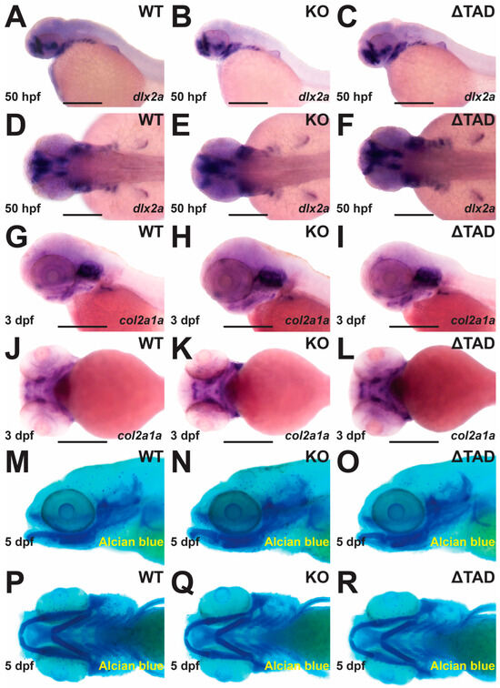 To investigate the effect of Stat3 mutations on cartilage formation, WISH with specific gene markers was also employed. No differences were observed between either Stat3 KO or ΔTAD mutants and WT embryos using either of the chondrocyte markers dlx2a [32] (Figure 5A–F) or col2a1a [33] (Figure 5G–L). Cartilage formation was also visualized through Alcian blue staining, which revealed both Stat3 KO and ΔTAD mutants had equivalent cartilage to their WT counterparts at 5 dpf (Figure 5M–R).