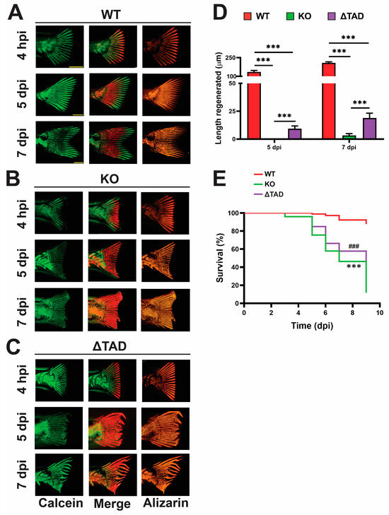 Effect of Stat3 mutations on fin regeneration. Representative images of wildtype (WT: A), knockout (KO: B), and transactivation domain truncation (ΔTAD: C) zebrafish subjected to staining with calcein and Alizarin red at the indicated timepoints, showing staining with each separately and then overlaid (Merge), with scale bars representing 1 mm. Quantification of caudal fin regeneration as the length from the amputation site to the newly formed fin ray tip (D) showing mean with SEM and statistical significance indicated (*** p < 0.001). Relative survival following amputation (E), presented as a Kaplan–Meier plot with statistical significance indicated between WT and KO (*** p < 0.001) as well as WT and ΔTAD (### p < 0.001).