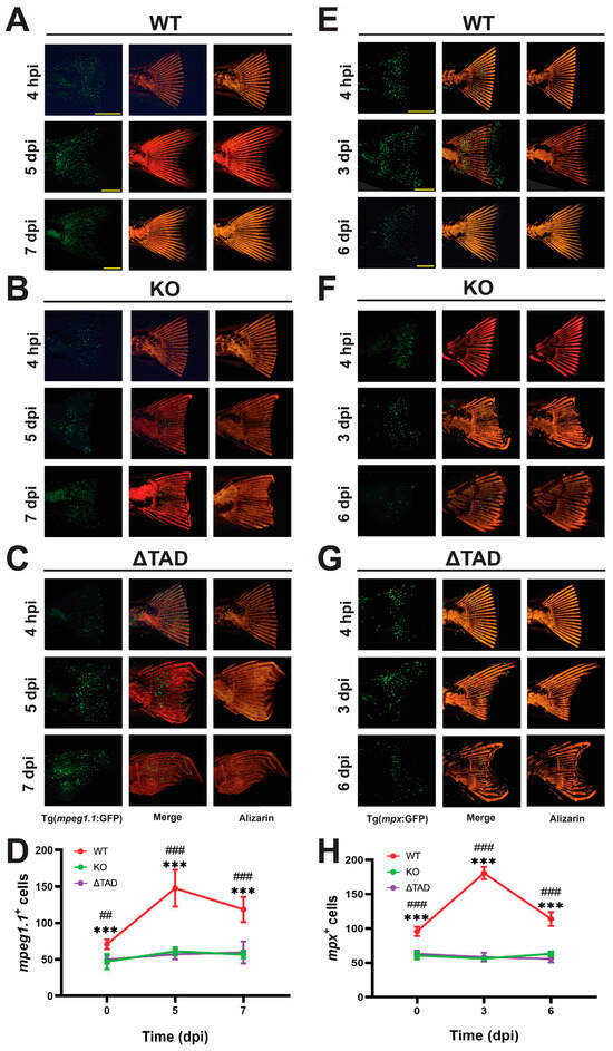 To assess the impacts on macrophages and neutrophils following amputation, Stat3 mutants on the Tg(mpeg1.1:GFP) and Tg(mpx:GFP) transgenic backgrounds, respectively, were used. The caudal fins of these were amputated and imaged over time using Alizarin red to visualize the skeletal structure, and GFP was used to visualize and quantify macrophages and neutrophils, as previously described [34]. Macrophage numbers in the caudal fin of the WT zebrafish significantly increased at 5 dpi and then decreased at 7 dpi (Figure 7A,D). In contrast, there was no significant change in the number of macrophages in Stat3 KO (Figure 7B,D) or Stat3 ΔTAD (Figure 7C,D) mutants, for which both were significantly decreased compared to that of the WT at all time points (Figure 7D). Neutrophil numbers were similarly increased in WT zebrafish with a peak at 5 dpi (Figure 7E,H), while no such increase was observed in either Stat3 KO (Figure 7F,H) or Stat3 ΔTAD (Figure 7G,H) mutants, with both again significantly lower than that of the WT at all time points (Figure 7H).
