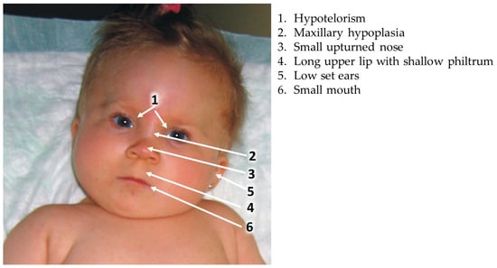 A specific set of facial dysmorphic features related to the effects of VPA on the developing embryo and fetus was first described by DiLiberti et al. in 1984, in seven infants [17]. This syndrome was later corroborated by many authors describing additional children exposed in utero to VPA and exhibiting similar facial features [11,18,21,62,63,64]. The main clinical findings include intrauterine growth retardation (IUGR), a long and thin upper lip, shallow philtrum, epicanthal folds and mid face hypoplasia manifested by a flat nasal bridge, small upturned nose and downturned angles of the mouth (Figure 1). Many of the children with “valproate syndrome” also have other congenital anomalies, developmental delay and neurological impairment [21]. A similar set of anomalies was also described in the offspring of women using other AEDs in pregnancy, with definitions representing quite similar facial dysmorphic features following in utero exposure to phenytoin, carbamazepine, phenobarbital, trimethadione and primidone [40,63]. Thus, it is accepted that these dysmorphic features constitute the “Antiepileptic Drugs Syndrome”.