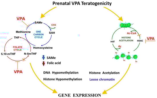 - Weinstein-Fudim, L.; Ergaz, Z.; Szyf, M.; Ornoy, A. Prenatal S-Adenosine Methionine (SAMe) Induces Changes in Gene Expression in the Brain of Newborn Mice That Are Prevented by Co-Administration of Valproic Acid (VPA). Int. J. Mol. Sci. 2020, 21, 2834. [Google Scholar] [CrossRef] [PubMed]