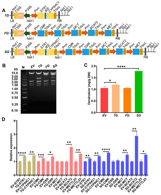 Multigene reconstruction to enhance dendrobine production. (A) Physical map of the multigene constructs used for integration and expression of the synthetic operons. The selected target genes are depicted as light blue boxes. Promotor Prrn is shown in dark yellow and terminator TrbcL in orange. The HPTII selectable marker gene for transformation is represented as a light yellow box. An intercistronic expression element (IEE) was put between STR1 and CYP94C1 operons to ensure the downstream cistron expression under the same promotor. (B) Not I-digestion analysis of pYLTAC380H-multigene (EV, TG, FG, and SG) constructs. M: DNA ladder marker. (C) Dendrobine content in D. catenatum leaves infiltrated with Agrobacterium tumefaciens carrying multigene constructs. There are three replicates for each sample. (D) The relative expression of each gene in a specific multigene construct. EV: empty vector; TG: two genes; FG: five genes; SG: seven genes. Asterisks indicate significance based on the Student’s t-test. * p ≤ 0.05; ** p ≤ 0.01; *** p ≤ 0.001; **** p ≤ 0.0001.