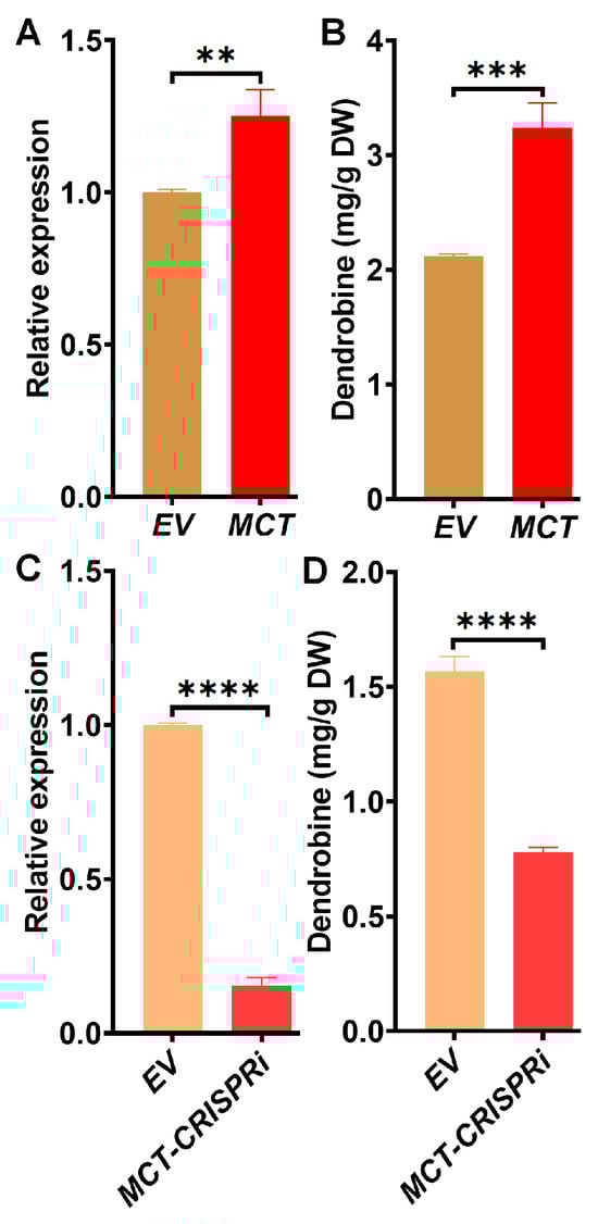 To further confirm the potential role of MCT in dendrobine synthesis, it was transiently overexpressed in D. catenatum leaves, with the overexpression being verified using qRT-PCR (Figure 2A). Dendrobine content was then measured in the same samples, revealing a significant increase compared to the vector control (Figure 2B). To further determine the key function of MCT in dendrobine synthesis, CRISPR-dCas9 was utilized to decrease its expression level (Figure 2C). Consequently, dendrobine content showed a significant reduction (Figure 2D), confirming that MCT played a crucial role in enhancing dendrobine yield.