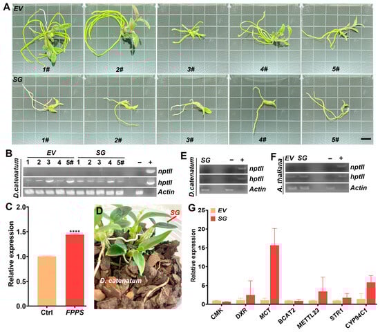 Generation and identification of multigene-transgenic plants. (A) Transgenic D. catenatum plantlets of SG-multigene (11-month-old) and EV control (13-month-old). (B) Analysis of the hptII transgene in SG-multigene and EV control transgenic D. catematum plantlets. DNA isolated from wild-type plants was used as the negative control “−”, while the hptII gene in the EV plasmid was used as the positive control “+”. DcActin was PCR amplified to demonstrate an equal amount of loading. nptII was amplified to avoid bacterial contamination. (C) FPPS expression was checked to demonstrate activation of the dendrobine synthesis pathway. EV transgenic D. catenatum served as the control (Ctrl). (D) SG-transgenic D. catenatum grown in pine-bark pots for 10 months. (E) Molecular characterization of the hptII transgene in SG-transgenic D. catenatum grown in pine-bark pots. (F) Molecular characterization of the hptII transgene in SG-transgenic Arabidopsis. (G) Expression analysis of individual genes in SG-transgenic Arabidopsis by qRT-PCR. Scale bar in (A) represents 1 cm. **** p ≤ 0.0001 represents significance.