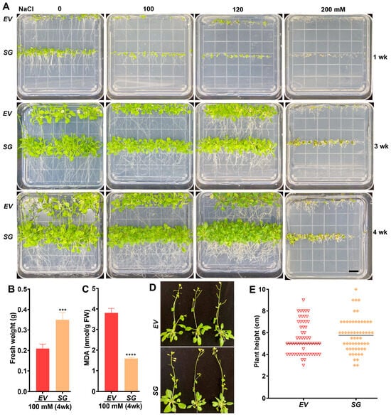 Arabidopsis seeds were germinated on a growth medium supplemented with different concentrations of NaCl (0, 100, 120, and 200 mM) or PEG6000 (0, 250, 400, 550 g/L) for varying periods (1, 3, and 4 weeks). SG-transgenic Arabidopsis exhibited an early flowering phenotype under normal conditions while showing increased salt tolerance compared to the vector control under stress conditions (Figure 4A). Specifically, SG-transgenic seedlings exposed to 100 mM NaCl treatment for four weeks gained more fresh weight (FW) (Figure 4B) in addition to the accumulation of lower levels of melondialdehyde (MDA) compared to the vector control transformants (Figure 4C). One-month-old plants exhibited a similar appearance and plant height (Figure 4D,E and Figure S2), indicating minimal influence of the transgene on plant development.
