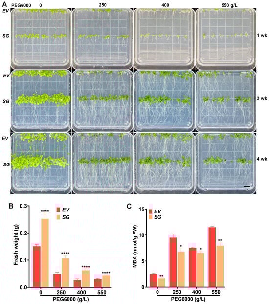SG-transgenic Arabidopsis was tolerant to drought stress. (A) Plant growth in response to different concentrations of PEG6000 (0, 250, 400, and 550 g/L). (B) Plant growth in terms of fresh weight under varied concentrations of PEG6000 for four weeks. (C) Cell damage in terms of MDA release under varied concentrations of PEG6000 for four weeks. * p ≤ 0.05; ** p ≤ 0.01; **** p ≤ 0.0001 represent significance. Scale bar represents 1 cm.