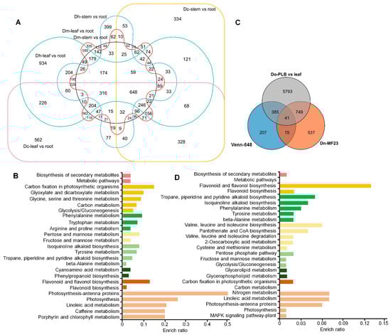 Dendrobine synthesis-related gene screening by Venn diagram and KEGG analysis. (A) Venn distribution of DEGs for transcriptomes of different tissues (stem vs. root; leaf vs. root) from three Dendrobium species (D. houshanense; D. catenatum, and D. moniliforme). (B) KEGG pathway enrichment of 648 DEGs from (A). The x-axis represents the enrichment ratio and the y-axis represents the pathway name. (C) Venn diagram representation of the number of DEGs in samples from protocorm-like bodies (PLBs), samples under MF23 treatment, and the 648 DEGs in (A). (D) KEGG pathway enrichment of DEGs from (C).
