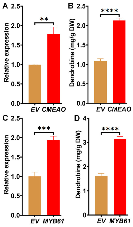 Further, CMEAO and MYB61 were evaluated for the regulation of dendrobine production. Each gene was transiently overexpressed in D. catenatum leaves, and the content of dendrobine in D. catenatum leaves at 5 dpi was determined through HPLC. Overexpression of CMEAO, identified through Venn diagram analysis (Figure 8A,B), and MYB61, isolated via WGCNA, significantly increased dendrobine content (Figure 8C,D). Specifically, overexpression of CMEAO resulted in a two-fold increase in dendrobine production, while overexpression of MYB61 led to a more than two-fold increase. These findings clearly demonstrated that the previously isolated genes including MCT, STR1, CYP94C1, and the newly isolated CMEAO and MYB61 played a crucial positive role in dendrobine metabolism, highlighting their potential as targets for enhancing dendrobine biosynthesis.