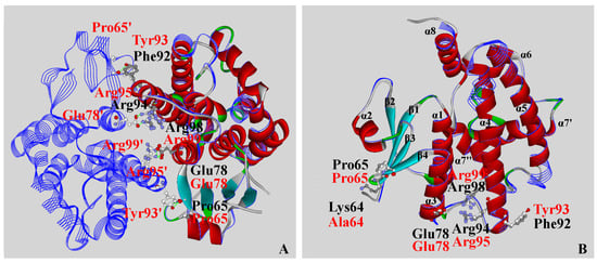 A significant number of conserved residues residing on the interfaces of tau class GST subunits were identified according to the sequence alignment with proteins having crystal structures in the protein data bank (PDB) (Figure 1). Three-dimensional structural alignment between the predicted tertiary structure of OsGSTU17 and structure of TaGSTU4 (PDB:1GWC) (Figure 2) revealed that the conserved amino acid residues, Pro65, Glu78, Phe92 (replacing conserved Tyr93 in TaGSTU4), Arg94, and Arg98 (alignment positions of 88, 101, 116, 118, and 122, respectively, in Figure 1) at the subunit interface of OsGSTU17 were superimposed on the residues at corresponding positions of TaGSTU4. Since these conserved amino acid residues mentioned above are responsible for formation hydrogen and salt bonds in TaGSTU4 to maintain interactions between subunits [16,17], it is speculated that these corresponding residues in OsGSTU7 might be involved in the dimerization of OsGSTU7. Interestingly, despite the natural absence of the hydrogen bond in OsGSTU17, this enzyme exhibited high stability and substrate activities [21], contrary to Wang’s observation [20], which showed that the replacement of the key residue Tyr93 with Phe led to an almost abolishment of its detoxification capability. Whether the dramatic decline in the enzymatic activities of mutant Y93F of TaGSTU4 is due to the natural replacement of a polar, positively charged Lys64 adjacent to Pro65 with a non-polar, hydrophobic Ala64 residue in TaGSTU4 needs to be clarified. Here, we explored site mutagenesis to substitute conserved residues Lys64 and Glu78 (alignment positions of 87 and 101, respectively, in Figure 1) in OsGSTU17 with Ala separately to understand the role of these amino acids in the interactions between subunits in OsGSTU17.