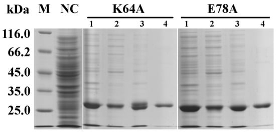 The two mutants, K64A and E78A, of OsGSTU17 were expressed in Escherichia coli BL21 (DE3), then purified by affinity chromatography. SDS-PAGE showed that the mutants were expressed in soluble forms (Figure 3), and both denatured proteins appeared as single bands on the gel, with a molecular weight of about 25.0 kDa, which was consistent with the expected theoretical molecular weight of the OsGSTU17 mutant monomer (Figure 3).