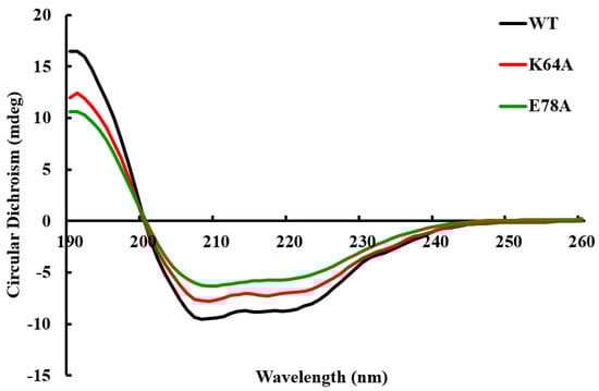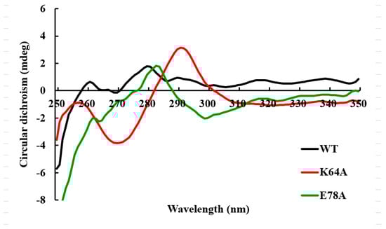CD spectra have been frequently adopted for the rapid determination of protein secondary structure and folding properties to examine the effects of mutations on protein conformation or stability [23]. Differences in far-UV CD absorbance (190–260 nm) reflect distinct variations in the secondary structures [24]. No significant change in secondary structures between mutants and wild-type OsGSTU17 was detected by far-UV CD spectroscopy analysis in this study (Figure 4). The percentages of α-helix, β-sheet, and random coils roughly calculated from the far-UV CD spectra showed that minor differences existed between the mutants and wild-type and were mainly located in the α-helix and antiparallel β-sheet (Table S1). The near-UV CD spectra (250–320 nm) reflect the properties of disulfide bonds and aromatic residues and inform the spatial conformation of aromatic residues, which were used to advise on protein tertiary structures [25,26,27]. Aromatic residues phenylalanine, tyrosine, and tryptophan exhibit distinct absorbance peaks in the wavelength regions of 250–270 nm, 270–290 nm, and 280–300 nm, respectively. The counts of residues and their conformational and environmental alterations would affect the CD signals, which would facilitate hinting at the subtle changes in protein tertiary structure caused by residue substitutions. According to the results of near-UV CD spectra (Figure 5), the mutation of the conserved amino acid residue Lys64 caused a significant change in the spatial conformation of tyrosine residues in the OsGSTU17 protein (the peak in the wavelength regions of 270–290 nm disappeared). The replacement in the conserved amino acid residue Glu78 led to the disappearance of the peak in the near-UV CD spectrum of the protein within the wavelength range of 280–300 nm, which represents the spatial conformation of tryptophan.
