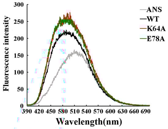 ANS (1-aniline-8-naphthalene sulfonate), a fluorescent dye with low fluorescence intensity in a polar environment, when noncovalently bound with hydrophobic surfaces of proteins, its fluorescence intensity would increase significantly, accompanied by a maximum blue shift emission [29,30]. The fluorescent intensity reflects the scale of hydrophobicity of protein surfaces, which provides a clue as to what variations occurred in protein tertiary structures. The maximum fluorescent intensities of mutants K64A and E78A were almost identical (about 250 nm) but higher than that of wild-type, which indicated that the hydrophobic areas of protein OsGSTU17 were enlarged to a similar extent after the residues Lys64 and Glu78 were substituted with alanine (Figure 6).