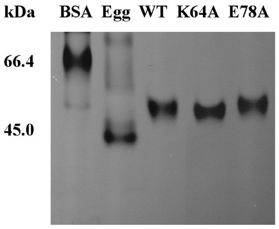 Native polyacrylamide gel electrophoresis of the purified mutant proteins and wild-type. BSA represents bovine albumin; egg represents ovalbumin.