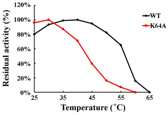 The substitutions of Lys64 and Glu78 with alanine decreased the thermal stability of OsGSTU17 to different extents, respectively (Figure 8). Compared with the wild-type, the enzyme activity of mutant E78A showed poor stability at 0 °C, with a 30% decrease in enzyme activity within 2 h at 0 °C. Therefore, reliable activity data for this enzyme could not be obtained within the range of 25 °C to 65 °C. The enzyme activity of mutant K64A remained 70% of its activity after heating at 40 °C for 15 min. Until the temperature increased to 60 °C, the enzyme activity of mutant K64A was completely abolished after being kept for 15 min. However, the wild-type OsGSTU17 still retained 80% of its maximum activity at 50 °C, while the mutant K64A only retained less than 20% activity at this temperature. The above results indicate that Glu78 is more important for the stability of OsGSTU17 than Lys64.