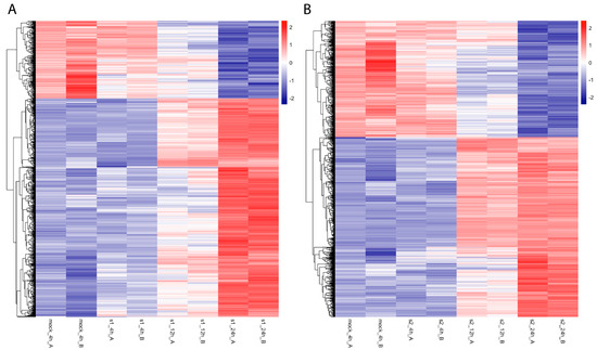 Heatmap of differentially expressed mRNAs (adjusted p-value < 10−5 at 24 h in comparison to mock 4 h) after SARS-CoV (A) and SARS-CoV-2 (B) infection. From left to right, mock 4 h and then infection time points at 4 h, 12 h, and 24 h of these gene expression levels are shown for each replicate A and B. After all SARS-CoV or SARS-CoV-2 infected samples were normalized using DESeq2, heatmaps were generated with normalized values of corresponding mRNAs using the R package heatmap with a scale-by-row option.